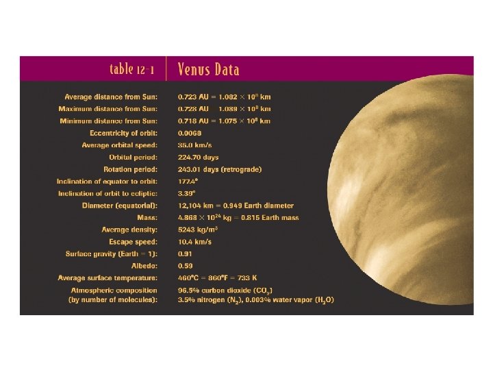 Venus has a hot, dense atmosphere and corrosive cloud layers • Spacecraft measurements reveal that 96. 5% of the Venusian atmosphere is carbon dioxide • Most of the balance of the atmosphere is nitrogen. • Venus’s clouds consist of droplets of concentrated sulfuric acid. • The surface pressure on Venus is 90 atm, and the surface temperature is 460°C • Both temperature and pressure decrease as altitude increases