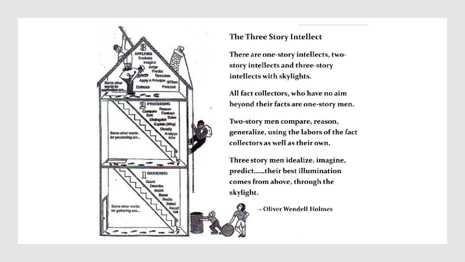 Verbs for Third Story Intellect Evaluate Predict Generate Speculate OUTPUT Imagine Apply a principle Judge If/Then Verbs for Second Story Intellect Compare Distinguish Contrast Explain PROCESS Classify Infer Sort Sequence Verbs for First Story Intellect Complete Identify Count Name INPUT Define Match Describe List Hypothesize Forecast Idealize Analyze Synthesize Make analogies Reason Recite Select Observe Scan