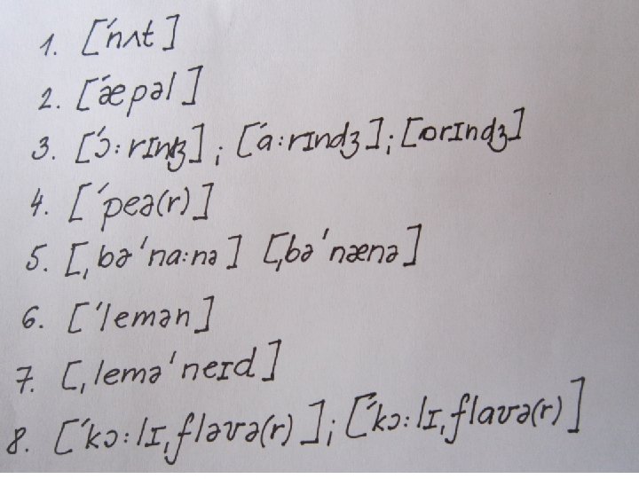 IPA Transcription – drill 1 Transcribe: 1. subject 2. Verb 3. Object 4. Adverb 5. Adverbial phrase 6. Preposition 7. Prepositional phrase 1. 8.
