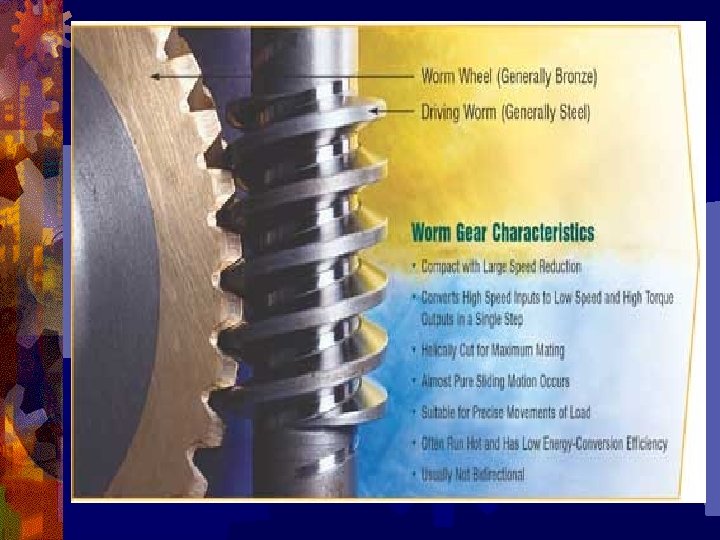 Worm Gears • Worm Gears are used when extreme strength and precision are required, they are a combination of a hypoid gear and a spur gear. • They provide very high gear reductions normally over 20 : 1 and even 40 : 1 • Unless the worm rotates the gear cannot turn, thus locking the load in position regardless of weight. • Many Worm Gears are used as Boat Winches due to their reliability and