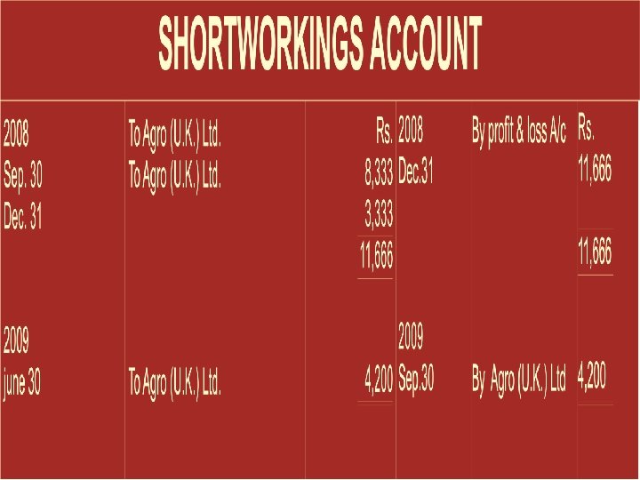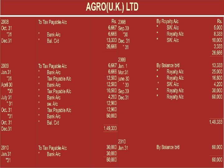 2008 Rs. 2008 5, 000 10, 000 Dec 31 2009 15, 000 2009 Mar 31 June 30 Sep 30 Dec 31 25, 000 16, 800 30, 000 60, 000 1, 31, 80 0 Dec 31 Sep 30 Dec 31 To Agro (U. K) Ltd To Agro (U. K) Rs By Profit & 15, 00 loss a/c 0 15, 00 By Profit & 0 loss a/c 1, 31, 800 1, 31,