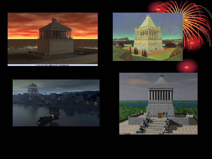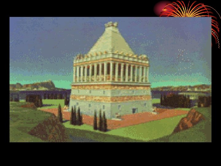 THE MAUSOLEUM AT HALICARNASSUS The Mausoleum of Halicarnassus was built on a hilltop over looking the city of Halicarnassus. It was a built there so the whole city would be able to see it. Mausolus, with his queen Artemisia, ruled over Halicarnassus and the surrounding territory for 24 years. Mausolus, though he was descended from the local people, spoke Greek and admired the Greek way of life and government. He founded many cities of Greek design along the coast and encouraged Greek democratic traditions. In 353 B. C. Mausolus died, leaving his queen Artemisia, who was also his sister (It was the custom in Caria for rulers to marry their own sisters), broken-hearted. As a tribute to him, she decided to build him the most splendid tomb in the known world. It became a structure so famous that Mausolus's name is now associated with all stately tombs through our modern word mausoleum. The building was also so beautiful and unique it became one of the Seven Wonders of the Ancient World. The mausoleum featured a rectangular basement beneath a colonnade formed by 36 columns. A stepped pyramid rested on the colonnade. At the top of the pyramid shaped roof was a statue of a four-horse chariot in which were statues of the king and queen. The Mausoleum overlooked the city of Halicarnassus for many centuries. It was untouched when the city fell to Alexander the Great in 334 B. C. and still undamaged after attacks by pirates in 62 and 58 B. C. . It stood above the city ruins for some 17 centuries. The top part of the mausoleum was destroyed by an earthquake, and in 1494 A. D the Knights of St. John, one of the knight groups in the crusades, used the marble blocks of the base of the mausoleum to make a castle. By 1522 A. D, almost every block had been torn down and used to make the castle. Today, the castle still stands, and with them, the separate pieces of the Mausoleum of King Maussollos.