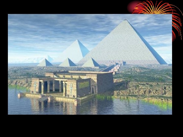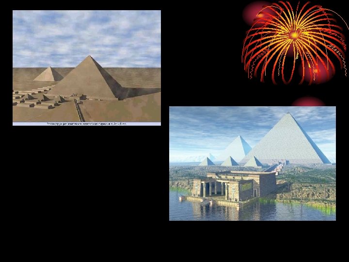 PYRAMIDS OF GIZA The great pyramids of Giza were built around 2700 -2500 BC as tombs for the pharoahs (rulers of ancient Egypt, who held the status of gods on earth ). The Great Pyramid of Khufu (Cheops to the Greeks) is the largest, pictured here in the left of the photograph, it covers 13 acres. It's 756 feet long on each side, 450 high and is composed of 2, 300, 000 blocks of stone, each averaging 2 1/2 tons in weight. Despite the makers' limited surveying tools no side is more than 8 inches different in length than another, and the whole structure is perfectly oriented to the points of the compass. The granite slab that is the roof of Khufu's burial chamber weighs 50 tons in itself. Until the 19 th century it was the tallest building in the world and, at the age of 4, 500 years, it is the only one of the famous "Seven Wonders of the Ancient World" that still stands. Some of the earliest history of the Pyramid comes from a Greek traveller named Herodotus of Halicanassus. He visited Egypt around 450 BC and included a description of the Great Pyramid in a history book he wrote. Herodotus was told by his Egyptian guides that it took twenty-years for a force of 100, 000 oppressed slaves to build the pyramid. Stones were lifted into position by the use of immense machines. In 1638 a English mathematician, John Greaves, visited the pyramid. He discovered a narrow shaft, hidden in the wall, that connected the Grand Gallery with the descending passage. Both ends were tightly sealed and the bottom was blocked with debris. Some archaeologists suggested this route was used by the last of the Pharaoh's men to exit the tomb, after the granite plugs had been put in place, and by the thieves to get inside. Given the small size of the passageway and the amount of debris it seems unlikely that the massive amount of treasure, including the huge missing sarcophagus lid, could have been removed this way. Some have suggested that the pyramid was never meant as a tomb, but as an astronomical observatory.