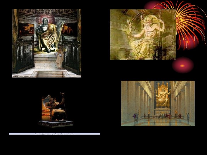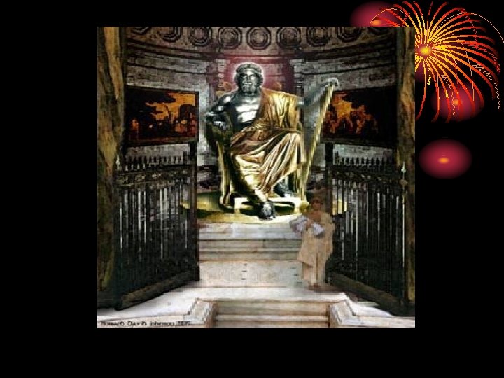 THE STATUE OF ZEUS AT OLYMPIA In ancient times the Greeks held one of their most important festivals, The Olympic Games, in honour of the King of their gods, Zeus. Like our modern Olympics, athletes travelled from distant lands, including Asia Minor, Syria, Egypt and Sicily, to compete in the games. The Olympics were first started in 776 B. C. and held at a shrine to Zeus located on the western coast of Greece in a region called Peloponnesus. The games, held every four years, helped to unify the Greek city-states. Sacred truce was declared during the games and wars were stopped. Safe passage was given to all travelling to the site, called Olympia, for the season of the games. In the early years of these games the shrine to Zeus was a simple affair, but as time went by and the games increased in importance, it became obvious that a new, larger temple, one worthy of the King of the gods, was needed. Between 470 and 460 B. C. , construction on a new temple was started. The designer was Libon of Elis and his masterpiece, The Temple of Zeus, was completed in 456 B. C. . The seated figure of Zeus was over forty feet high ( 12 meters) and dominated most of the interior of the temple. Zeus was the most powerful of the gods, and many of the participants of the Olympics paid homage to him before the games. The huge statue of Zeus took up almost the entire interior of the temple. Made entirely of ivory and gold, The Statue of Zeus was covered with symbols of victory and conquest. The statue may have been the most magnificent of the Seven Wonders of the Ancient World. In the year 391 A. D. the temple in Olympia, about 150 miles west of Athens, where the statue stood had a very bad year. Earthquakes, land-slides, and floods destroyed the temple. The only remaining part of the temple are the ruins and the foundation of the structure. Earlier, however, Zeus was transported to a palace in Constantinople, now Istanbul, by wealthy Greek men where it was eventually destroyed by a fire near the fall of the Western Roman Empire in 462 A. D.
