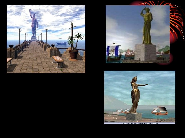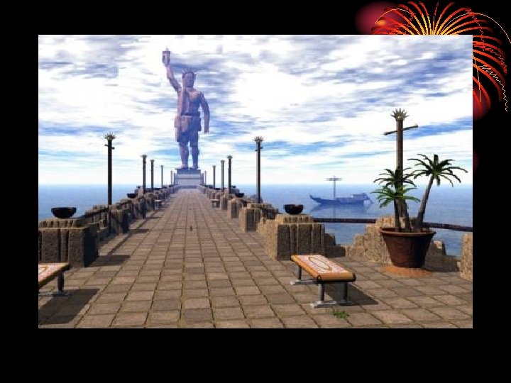 THE COLOSSUS OF RHODES The Colossus was located at the entrance of the harbor of the Mediterranean island of Rhodes in Greece. The island of Rhodes was an important economic centre in the ancient world. It is located off the southwestern tip of Asia Minor where the Aegean Sea meets the Mediterranean. The capitol city, also named Rhodes, was built in 408 B. C. and was designed to take advantage of the island's best natural harbour on the northern coast. To celebrate a victory over Demetrius the Rhodians decided to build a giant statue of their patron god Helios. They melted down bronze from the many war machines Demetrius left behind for the exterior of the figure and the super siege tower became the scaffolding for the project. According to Pliny, a historian who lived several centuries after the Colossus was built, construction took 12 years. Other historians place the start of the work in 304 B. C. . The statue was one hundred and ten feet high and stood upon a fifty-foot pedestal near the harbour mole. Although the statue has been popularly depicted with its legs spanning the harbour entrance so that ships could pass beneath, it was actually posed in a more traditional Greek manner: nude, wearing a spiked crown, shading its eyes from the rising sun with its right hand, while holding a cloak over its left. The Colossus was a huge bronze statue of Helios, the sun god. From its building to its destruction by an earthquake (224 BC) lies a time span of merely 56 years. Yet the colossus earned a place in the famous list of Wonders. "But even lying on the ground, it is a marvel", said Pliny the Elder. The Rhodian sculptor Chares of Lindos worked for 12 years on the statue. He used stone blocks and about 7 1/2 short tons (6. 8 metric tons) of iron bars to support the hollow statue. The huge pieces were left where they fell and were looked upon with awe for centuries to come. Nearly a thousand years later, in AD 656, a scrap metal dealer bought the pieces and had them melted down.