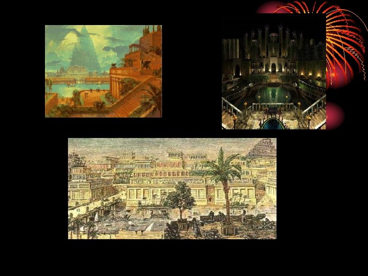 THE HANGING GARDENS OF BABYLON The Gardens is thought to have been situated on the east bank of the River Euphrates, some 50 km south of what is now Baghdad, in Iraq. It is believed that the Gardens were built by King Nebuchadnezzar II. The ancient city of Babylon, under King Nebuchadnezzar II, must have been a wonder to the traveller's eyes. "In addition to its size, " wrote Herodotus, a historian in 450 BC, "Babylon surpasses in splendour any city in the known world. " Herodotus claimed the outer walls were 56 miles in length, 80 feet thick and 320 feet high. Wide enough, he said, to allow a four-horse chariot to turn. The inner walls were "not so thick as the first, but hardly less strong. " Inside the walls were fortresses and temples containing immense statues of solid gold. Rising above the city was the famous Tower of Babel, a temple to the god Marduk, that seemed to reach to the heavens. While archaeological examination has disputed some of Herodotus's claims (the outer walls seem to be only 10 miles long and not nearly as high) his narrative does give us a sense of how awesome the features of the city appeared to those that visited it. Interestingly enough, though, one of the city's most spectacular sites is not even mentioned by Herodotus: The Hanging Gardens of Babylon, one of the Seven Wonders of the Ancient World. Accounts indicate that the garden was built by King Nebuchadnezzar, who ruled the city for 43 years starting in 605 BC (There is a less-reliable, alternative story that the gardens were built by the Assyrian Queen Semiramis during her five year reign starting in 810 BC). This was the height of the city's power and influence and King Nebuchadnezzar constructed an astonishing array of temples, streets, palaces and walls. According to accounts, the gardens were built to cheer up Nebuchadnezzar's homesick wife, Amyitis, daughter of the king of the Medes, was married to Nebuchadnezzar to create an alliance between the nations. The land she came from, though, was green, rugged and mountainous, and she found the flat, sun-baked terrain of Mesopotamia depressing. The king decided to recreate her homeland by building an artificial mountain with rooftop gardens. The Hanging Gardens probably did not really "hang" in the sense of being suspended from cables or ropes. The name comes from an inexact translation of the Greek word kremastos or the Latin word pensilis, which mean not just "hanging", but "overhanging" as in the case of a terrace or balcony.
