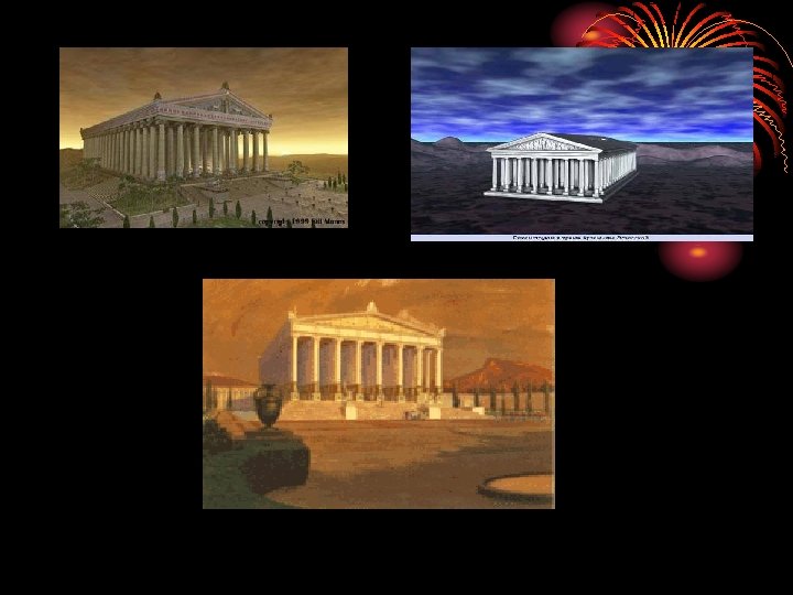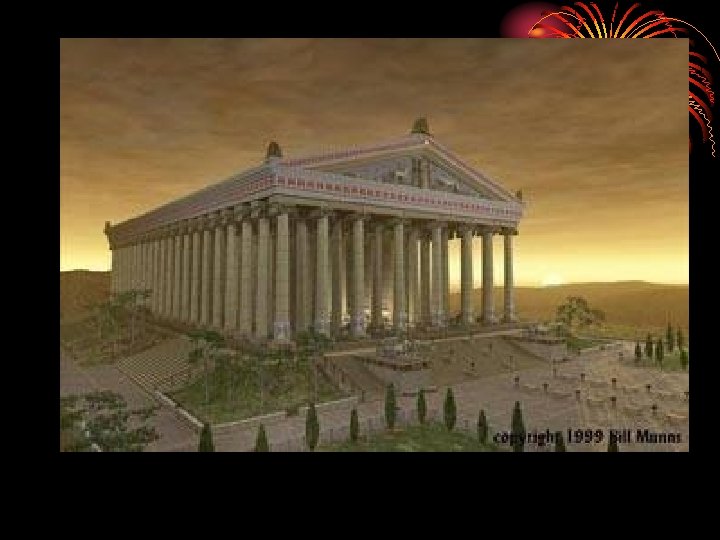 THE TEMPLE OF ARTEMIS The temple stood in the Greek city of Ephesus, on the west coast of what is now Turkey. Although the original foundation of the temple dates back to the seventh century BC, the structure that we know as one of the Wonders was built around 550 BC. This was the largest and most complex temple of ancient times. It was made of marble with a tile covered wooden roof. The temple was built by an architect named Cherdiphron and his son, Metagenes. Ephesus was one of the greatest Ionian cities. The early Greek colonists at Ephesus, in Asia Minor, built a temple to Artemis (called Diana by the Romans) which was rebuilt and enlarged from time to time. Its foundation measured 115 by 55 meters. It had 106 columns, about 12 meters high, in a double row about the cella. It took 120 years to build and was finished in 430 BC. On the night of 21 July 356 BC, a man named Herostratus burned the temple to ground in an attempt to immortalize his name. Strangely enough, Alexander the Great was born the same night. Another one like it was built on the same foundation. Goths burned down the second temple in A. D. 262. Only the foundation and parts of the second temple remains. The British Museum in London contains sculptures from the second temple.