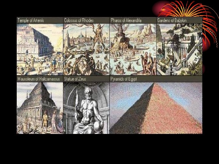 The Lighthouse of Alexandria The Mausoleum at Halicarnassus The Pyramids of Giza The Statue of Zeus at Olympia The Colossus of Rhodes The Hanging Gardens of Babylon The Temple of Artemis