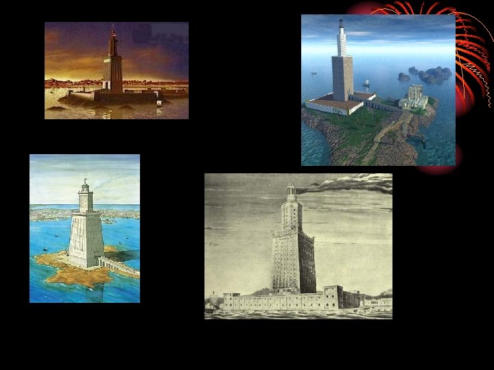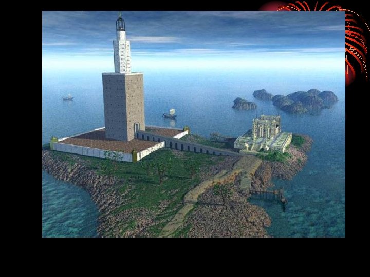THE LIGHTHOUSE OF ALEXANDRIA Of the Seven Wonders of the Ancient World, only one had a practical use in addition to its architectural elegance it was the Lighthouse of Alexandria. For sailors, it ensured a safe return to the Great Harbor. The Lighthouse of Alexandria stood over 122 meters high and it was the tallest building on Earth. It stood on the island of Pharos in the harbor of Alexandria, in Egypt. Scientist to this day are still fascinated by the mirror whose reflection could be seen up to 50 kilometers away. It is interesting to note that the word "pharos" came to mean lighthouse. In the fall of 1994 a team of archaeological scuba divers entered the waters off of Alexandria, Egypt. Working beneath the surface they searched the bottom of the sea for artifacts. Large underwater blocks of stone were marked with floating masts so that an Electronic Distance Measurement station on shore could obtain their exact positions. Global positioning satellites were used to further fix the locations. The information was then fed into computers to create a detailed database of the sea floor. Ironically, these scientists were using some of the most high-tech devices available at the end of the 20 th century to try and discover the ruins of one of the most advanced technological achievements of the 3 rd century, B. C. :