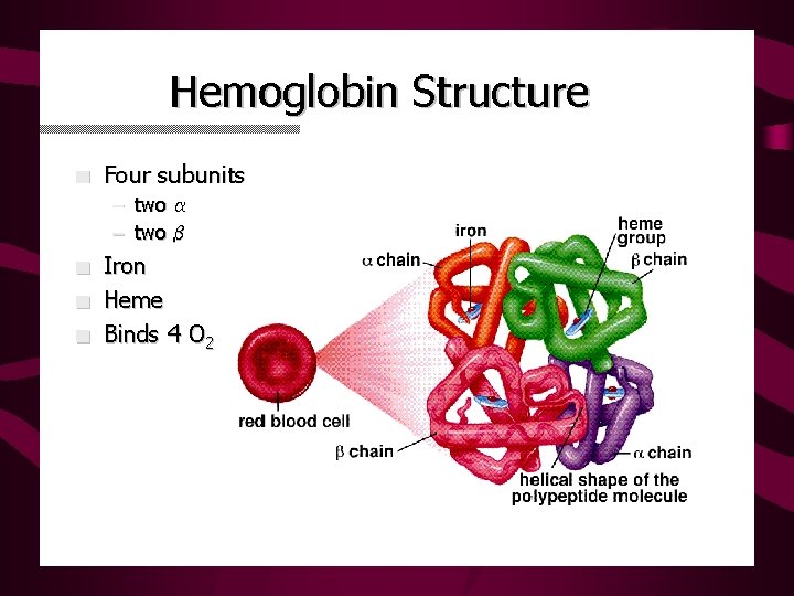 Hemoglobin Review • Each complex consists of : – Four polypeptide chains, non-covalently bound – Four heme complexes with iron bound – Four O 2 binding sites