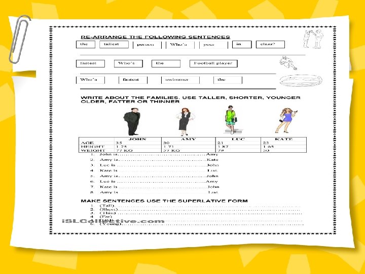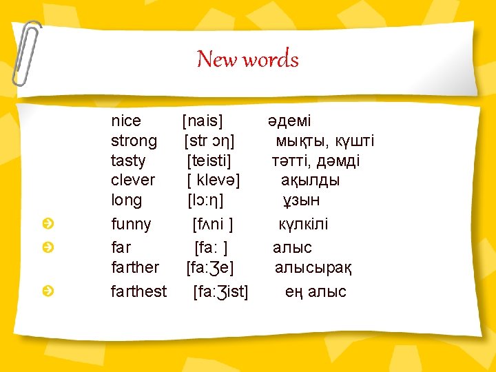 Check each other Taller, nice, biggest, cleverest, longer, tastier, long The giraffe has a long neck. Russia is the biggest country in the world. Monkey’s tail is longer than cats tail. My little brother is very nice. I think that bananas are tastier than oranges. Bob is the cleverest pupil in the class.