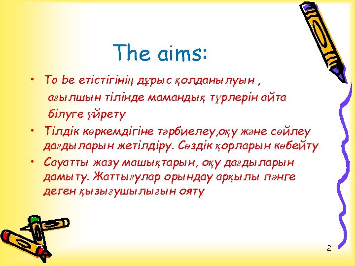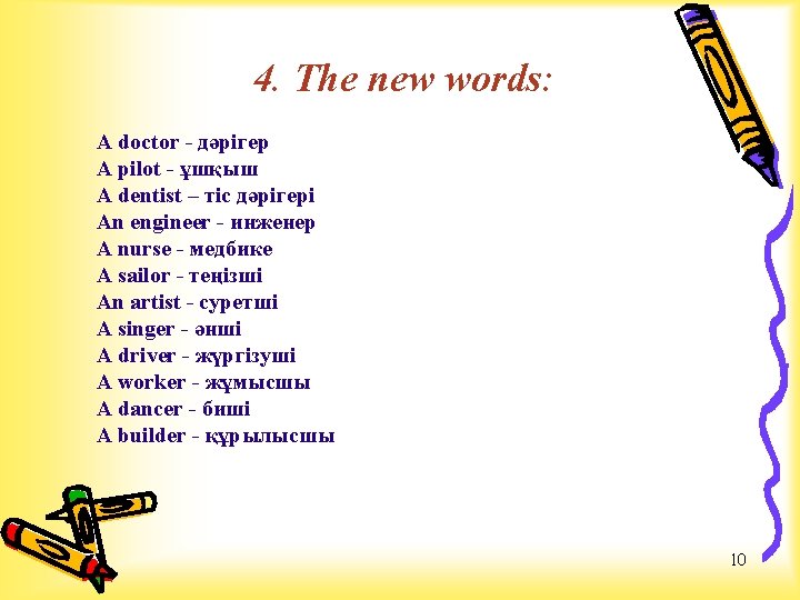 Ex. 2 Fill in the gaps with the correct forms of to be. Translate the sentences (to be етістігін тиісті формаға қойып, сөйлемдерді аудар): 1. I …… a doctor. 2. They …… artists. 3. …… you a dentist? 4. …… I an engineer? 5. I …… not an officer. 6. …… she a housewife? 7. My mother …… not an economist. 8. We ……… not pupils.