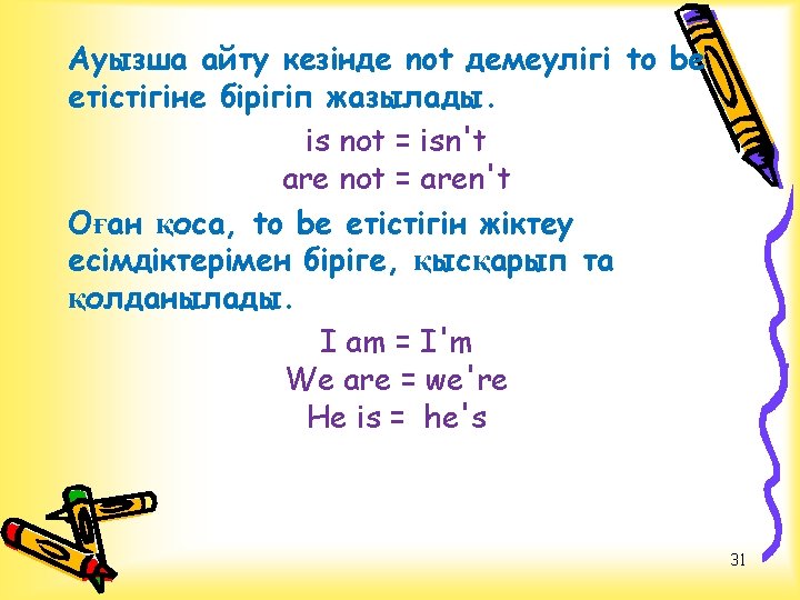 To be етістігінің осы шақта жіктелген түрі (Present Simple (Indefinite)): Болымды Болымсыз I am not (am not) Am I? He is not (isn't) Is he? She is not (isn't) Is she? It is not (isn't) Is it? We are not (aren't) Are we? You are not (aren't) Are you? They are not (aren't) Сұраулы Are they? 28