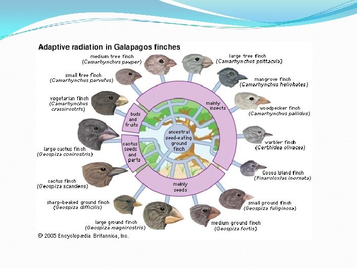Speciation in Darwin’s Finches Founder’s arrived Geographic isolation – on different islands Changes in the gene pool – depended on the food source Reproductive isolation- Mates choose specific traits so the different birds would not reproduce with each other Ecological competition-Competed for resources Continued evolution- over a long time this process kept occuring (14 species of Galapagos Finches exist)