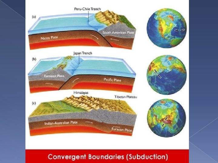 Convergent Boundaries � Two plates colliding (Three types of collisions) › Ocean – Continental: ocean crust is denser, so it is subducted: forced under the continental crust �Ocean trench forms �Subducting crust melts, some rises through the continental crust to form volcanic mountains