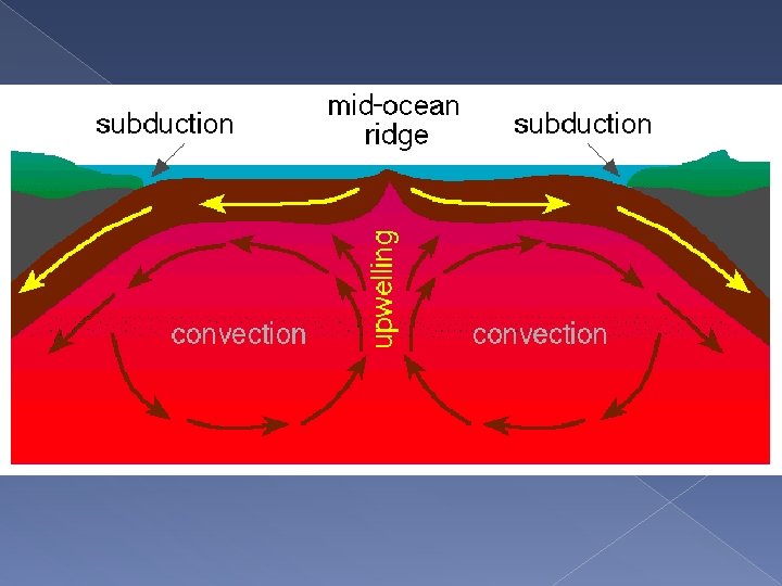 Causes of Plate Motion � Convection › Hot asthenosphere rises, cools, sinks convection currents › Lithospheric plates ride on top of these conveyer belts � Evidence: More heat near divergent plate boundaries than elsewhere along ocean floor