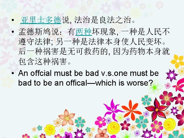 What’s the essence of rule of law? • Rule of law(法治) • Rule by man(人治) • What’s the fundamental difference between these two terms?