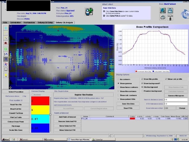 DQA n Tomotherapy Supplied Phantoms n Film and Point dose taken on every patient n Planning system has built-in QA tools n Film analysis evaluated by calculating gamma index (Low et. al. , Med Phys 25, 1998) n n 3% Dose 3 mm DTA