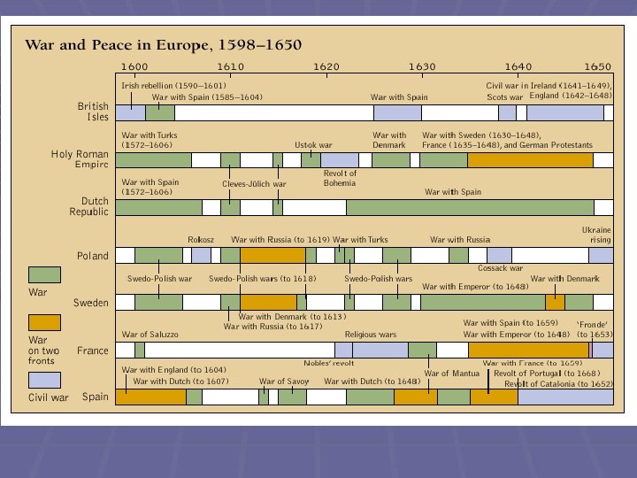 § The Thirty Years' War (1618 -1648) § The most destructive European war up to WWI § Began as a local conflict in Bohemia; eventually involved most of Europe § Devastated the Holy Roman Empire (German states): lost onethird population § Saw rise of Sweden as Great Power and eclipse of Spain, Hapsburgs as European great power § Saw independence of Holland, Switzerland from Holy Roman Empire § Ended with Germany neither holy, nor Roman nor an Empire § Peace of Westphalia § Scottish Presbyterians revolt § Expel Catholic Queen with England’s secret assistance § Raise her kidnapped son James as Presbyterian