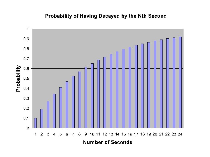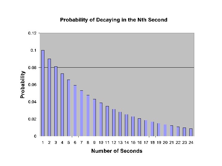 imagine the probability of decaying within any single second is p = 0. 10 the probability of surviving that same single second is p = 0. 90 P(N) probability that it decays in the Nth second (but not the preceeding N-1 seconds) P(1) P(2) P(3) P(4) P(5) P(6) P(7) P(8) P(9) = 0. 10 = = 0. 902 0. 10 = = 0. 903 0. 10 = = 0. 904 0. 10 = = 0. 905 0. 10 = = 0. 906 0. 10 = = 0. 907 0. 10 = = 0. 908 0. 10 =