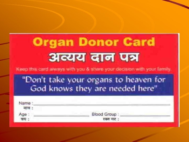 THE TRANSPLANTATION OF HUMAN ORGAN RULES 1995 DUTIES OF MEDICAL PRACTIONER – Authorization in Form no. 1 by donor Medical fitness certificate (Form no. 2) If donor is a near relative then Form no. 3 is filled after establishing relation If donor is spouse then sign a certificate in Form no. 4 Donor had authorised in presence of two witnesses authorised removal of organ from his body, in Form No. 5