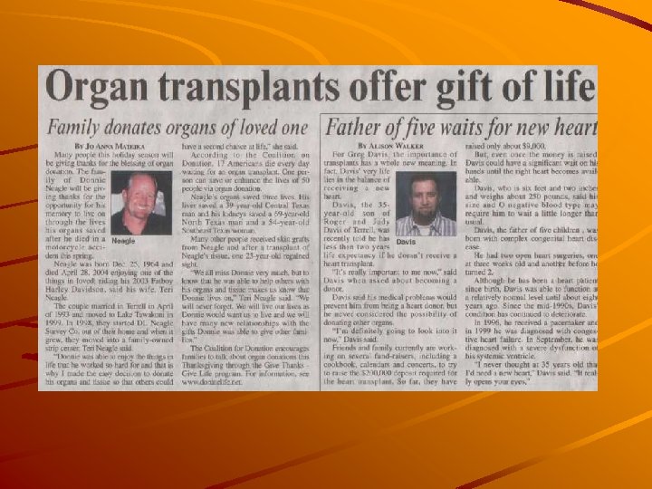 Numbers of Transplants Performed During 2006 17, 092 kidney transplants 6, 650 liver transplants 463 pancreas transplants 954 kidney-pancreas transplants 175 intestine transplants 2, 192 heart transplants 31 heart-lung transplants 1, 405 lung transplants 28, 932 TOTAL TRANSPLANTS PERFORMED* • Based on data from the Organ Procurement and Transplantation Network of the U. S. Department of Health and Human Services, as of June 29, 2007 -- data subject to change due to future submissions or corrections.