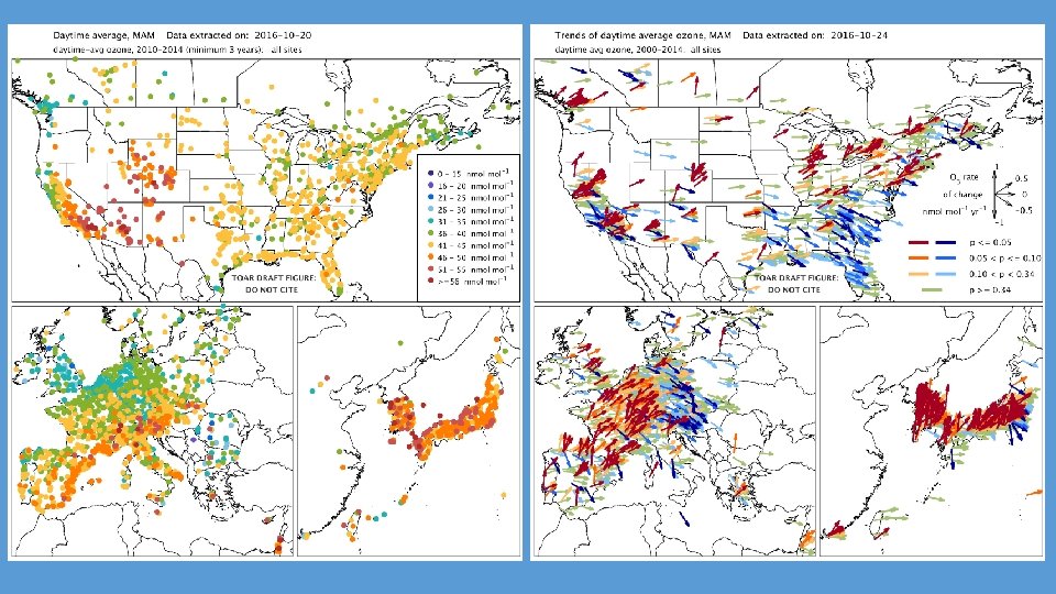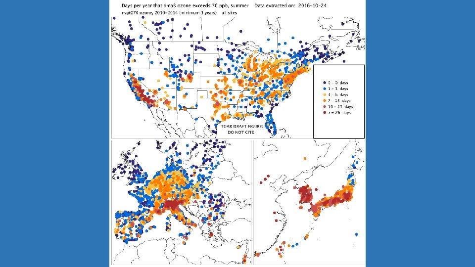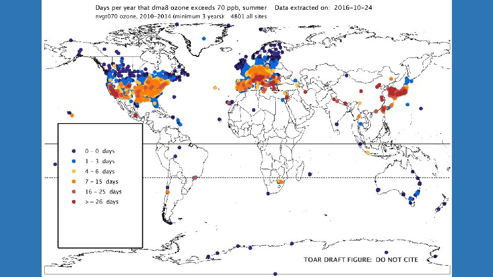 TOAR database analysis: Present-day: average conditions over 2010‐ 2014, approximately 4800 sites world wide Trends: focusing on the 15‐year period of 2000‐ 2014, approximately 2600 sites world wide Subsets of sites were designated as urban or rural using an objective classification algorithm based on: NOAA nighttime lights of the world, 1 km resolution Columbia U. CIESIN global population, 5 km resolution OMI tropospheric column NO 2, provided by Environment Canada, 10 km resolution The following slides display average ozone observations from the database for the present day period (2010‐ 2014) as well as linear trends for the period 2000‐ 2014. The analysis focuses on the summertime period of April‐September in the Northern Hemisphere and October‐March in the Southern Hemisphere.