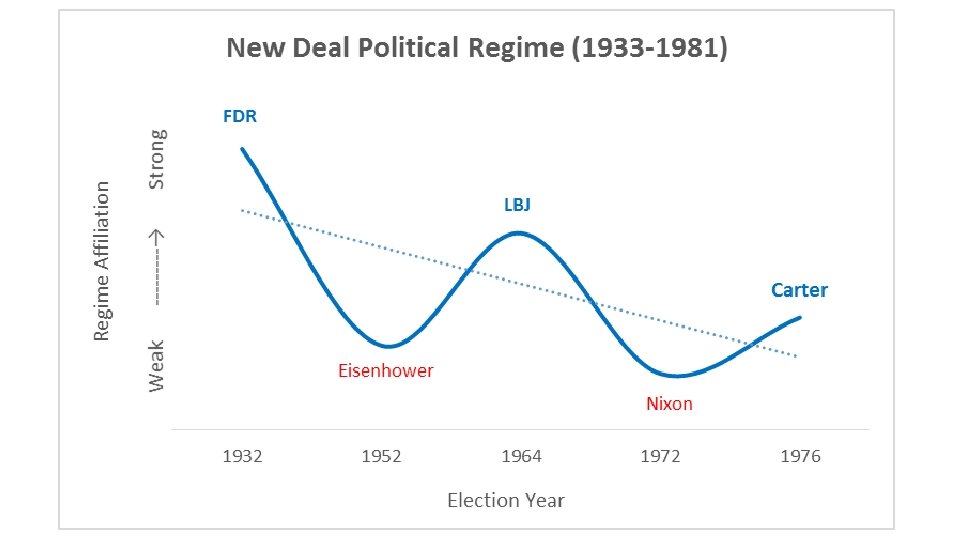 New Left Political Regime • Obama sketched an outline of what an alternative to Reaganism might look like but he was unable to dislodge the New Right orthodoxy and was forced to govern within its constraints. • Consider another preemptive president: Richard Nixon. He had this idea of the Southern strategy, a way to break white voters off from the Democratic Party, but the regime of New Deal liberalism was too strong for him to accomplish a wholesale political reconstruction. That had to wait for Ronald Reagan and over the course of the New Right regime, white southerners increasingly switched their party affiliations and votes from Democrats to Republicans. • Similar to Nixon, Obama had this idea of a diverse coalition (educated, urban whites; racial minorities; immigrants; gays and lesbians; young people, etc. ) but he failed to displace the old New Right orthodoxy. • If you have a real disjunctive moment now, if conservatism finally implodes, if it exposes through its insufficient actions the impossibility of its own formula, then we should expect Trump to be replaced by a genuine reconstructive leader, someone who can firmly repudiate Reaganism and completely redefine the terms and conditions of legitimate national government. • This would most easily be accomplished by a “new, ” “young, ” Democrat who adopts the Obama language of inclusion but backs it up with a new ideological direction and coalition of interests combined with institutional changes to sustain them over the coming decades. • Democrats are already jockeying to be the next reconstructive president: Cory Booker, Kamala Harris, Tom Perez, the Castro brothers….