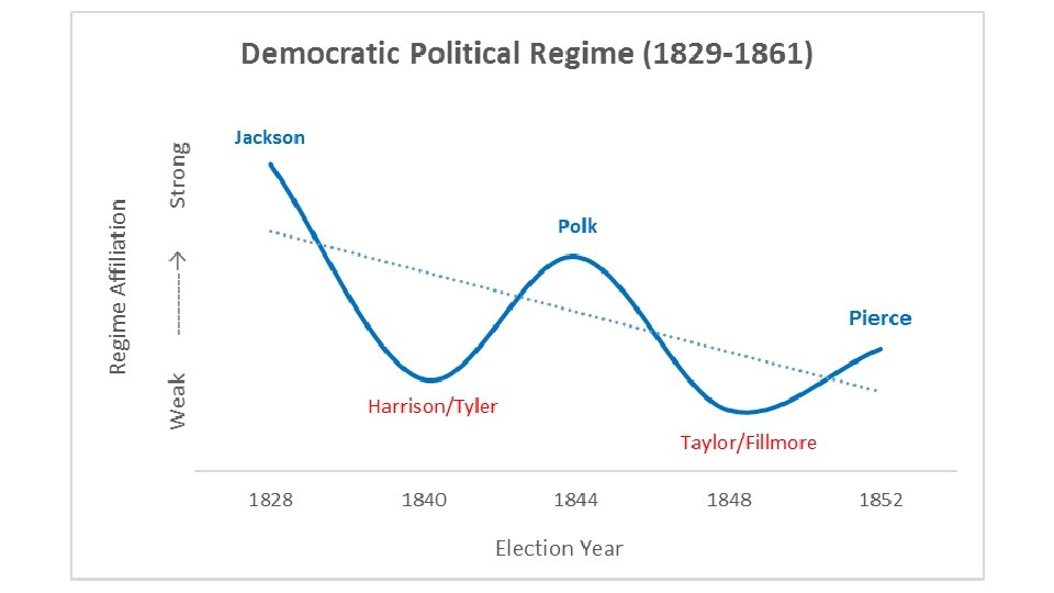 American Political Regimes: Articulation • Reconstructive presidents are followed by presidents from the same party who articulate the regime’s commitments. • These are the “heir apparents” and “faithful sons” who apply the orthodoxy of the regime to new issues that arise. • But in doing so, the coalition of interests that held together during the reconstruction begins to fray and these presidents often abdicate or otherwise depart the office under heavy criticism: Monroe, Polk, Theodore Roosevelt, LBJ, and Bush II.