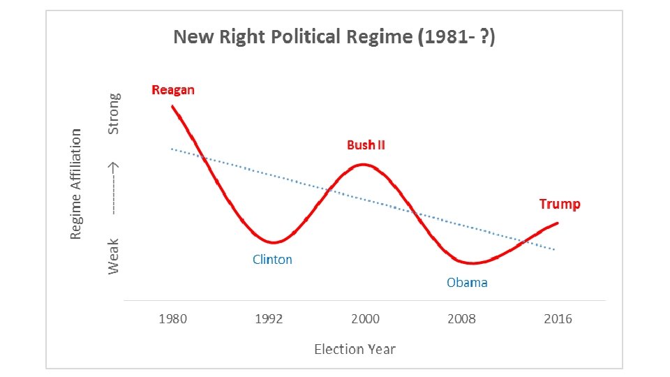 New Left Political Regime • Obama sketched an outline of what an alternative to Reaganism might look like but he was unable to dislodge the New Right orthodoxy and was forced to govern within its constraints. • Consider another preemptive president: Richard Nixon. He had this idea of the Southern strategy, a way to break white voters off from the Democratic Party, but the regime of New Deal liberalism was too strong for him to accomplish a wholesale political reconstruction. That had to wait for Ronald Reagan and over the course of the New Right regime, white southerners increasingly switched their party affiliations and votes from Democrats to Republicans. • Similar to Nixon, Obama had this idea of a diverse coalition (educated, urban whites; racial minorities; immigrants; gays and lesbians; young people, etc. ) but he failed to displace the old New Right orthodoxy. • If you have a real disjunctive moment now, if conservatism finally implodes, if it exposes through its insufficient actions the impossibility of its own formula, then we should expect Trump to be replaced by a genuine reconstructive leader, someone who can firmly repudiate Reaganism and completely redefine the terms and conditions of legitimate national government. • This would most easily be accomplished by a “new, ” “young, ” Democrat who adopts the Obama language of inclusion but backs it up with a new ideological direction and coalition of interests combined with institutional changes to sustain them over the coming decades. • Democrats are already jockeying to be the next reconstructive president: Cory Booker, Kamala Harris, Tom Perez, the Castro brothers….
