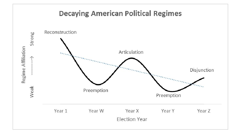 American Political Regimes: Preemption • In between the presidencies held by those affiliated with the political regime are presidents from the opposition party who temporarily preempt the regime. • These are the wild cards of American politics with some preemptive presidents able to achieve success (e. g. Cleveland, Eisenhower) by moderating their party’s positions on issues and working with the party that transformed the regime. • However, because they are opposition presidents, they have critics on all sides who attempt to delegitimize them and destroy their presidencies. • Thus, preemptive presidents are often delegitimized and/or impeached: Andrew Johnson, Nixon, Clinton.
