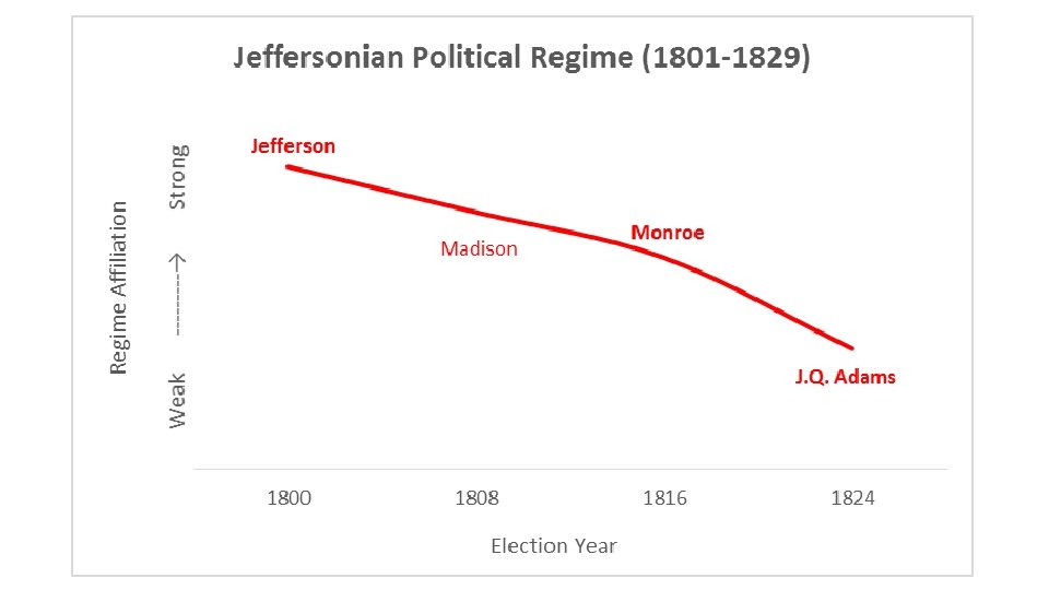 American Political Regimes: Articulation • Reconstructive presidents are followed by presidents from the same party who articulate the regime’s commitments. • These are the “heir apparents” and “faithful sons” who apply the orthodoxy of the regime to new issues that arise. • But in doing so, the coalition of interests that held together during the reconstruction begins to fray and these presidents often abdicate or otherwise depart the office under heavy criticism: Monroe, Polk, Theodore Roosevelt, LBJ, and Bush II.