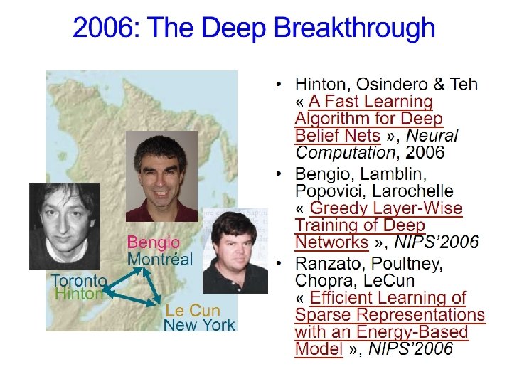 Deep Learning Breakthrough: 2006 Unsupervised learning of shallow features from large amounts of unannotated data Features are tuned to specific tasks with second stage of supervised learning