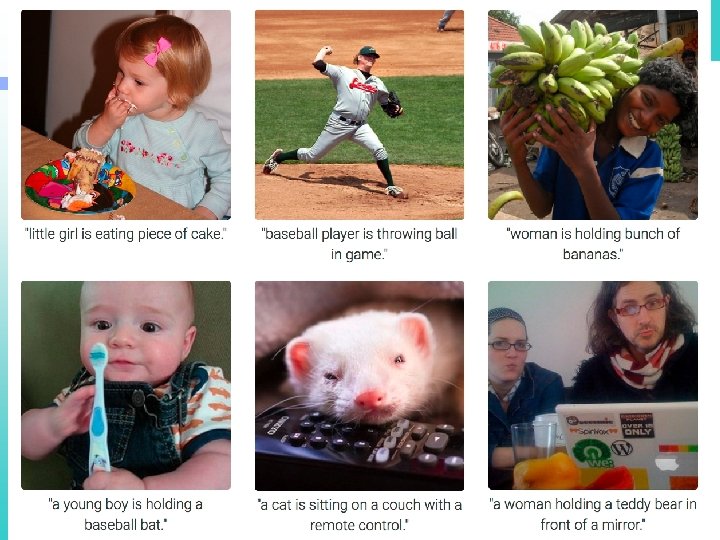 Image Captioning Extract features from images with CNN Input to LSTM Trained on MSCOCO Target sequence Un gato con un - Un gato con § 300 k images, 6 caption/image Image features