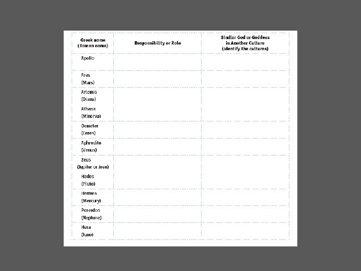 You may already be familiar with some of the Greek and Roman gods. Complete the chart on p. 50 of Spring. Board as you read through the information on the following slides. Fill in the responsibilities or roles in the middle column. Then, instead of filling in the third column with names from other cultures, tell at least one bit of information not already noted on the chart, which you learned from the slides.