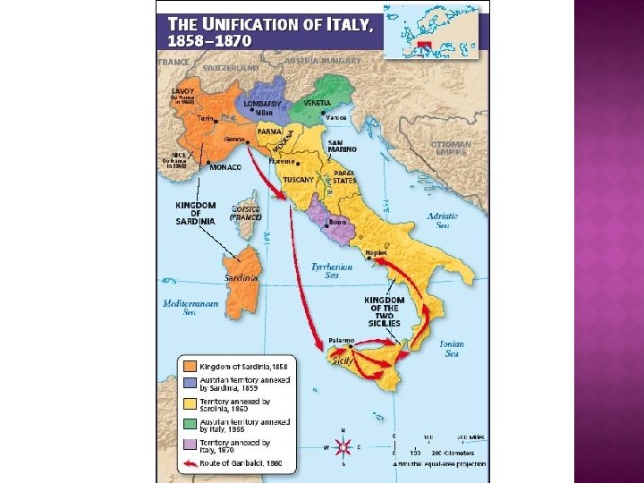 � 1852, Cavour became Prime Minister � Worked toward rebuilding a thriving economy so that Italy could unify (as a monarchy) � Cavour aligned Sardinia with France �Sardinia supported France in war with Russia & gave them the provinces of Savoy & Nice �In turn, France supported Sardinia in its war against Austria - (successful liberation)