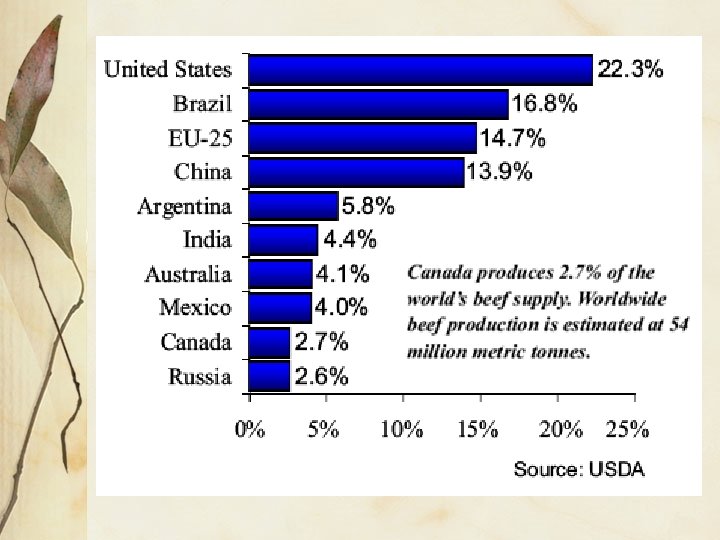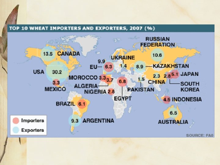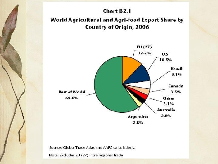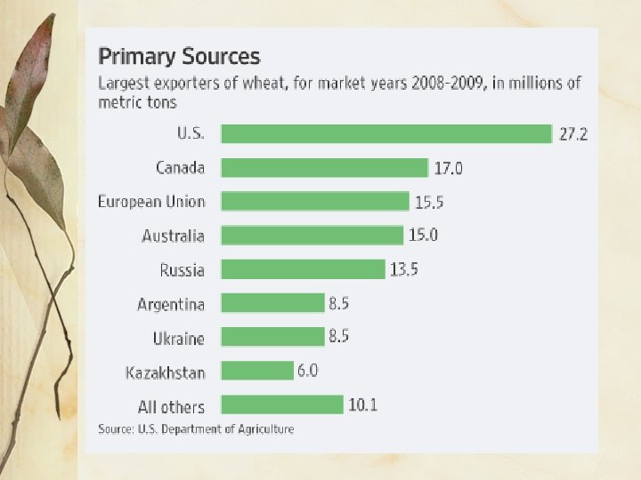 U. S. Agricultural Products Wheat, corn, other grains, fruits, vegetables, cotton Beef, pork, poultry, dairy products, fish