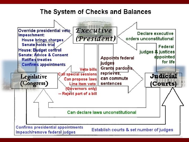 Checks and Balances n. A system of checks and balances safeguards against abuse of power n Each branch of government has the power to check, or limit, the actions of the other two. n This arrangement guarantees that no branch of government will become too powerful n Page 257 – the chart describes the specific checks each branch has on the other two