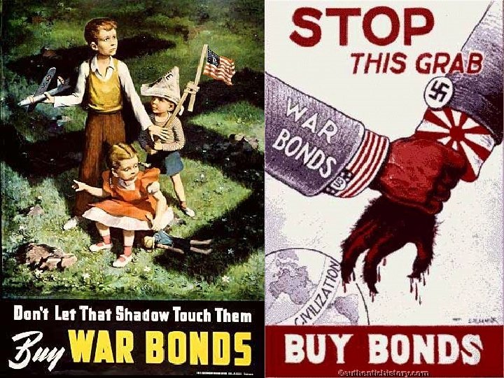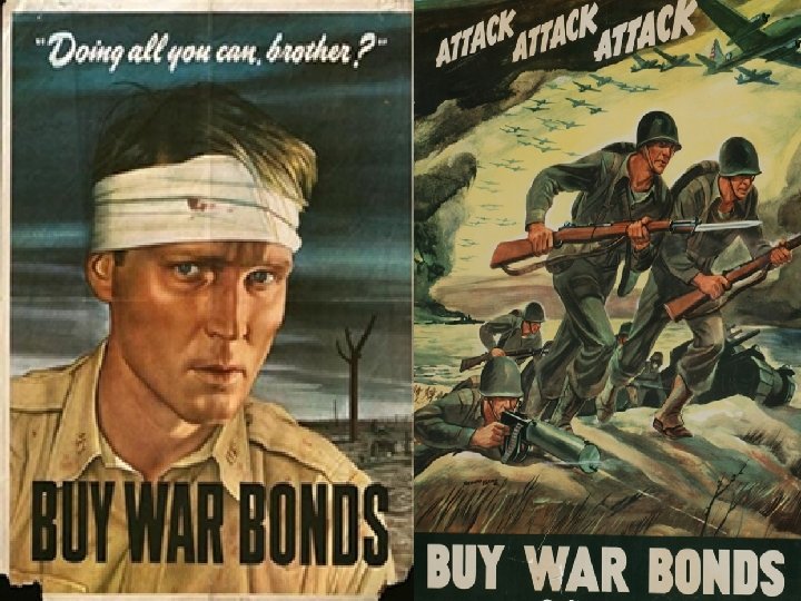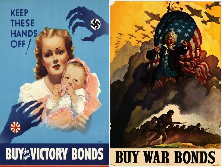 “War” and “Victory Bonds • Still dealing with the debt from deficit spending from the Depression, the government sold these saving bonds to finance the war • To make it more patriotic, they were called “war” or “victory” bonds