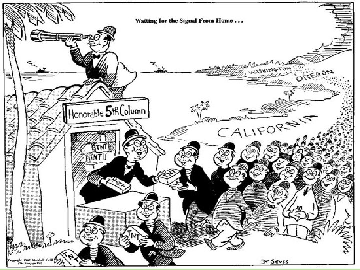 The ugly side of patriotism • The same patriotism that helped lift America to victory during WWII, was unfortunately the same that led to the gross civil rights violations against one group of people in the United States. • Which group? Why not allow Dr. Seuss tell us…
