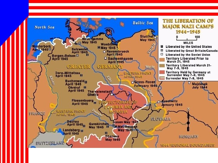 LIBERATION OF DEATH CAMPS • While the British and Americans moved westward into Germany, the Soviets moved eastward into Germancontrolled Poland • The Soviets discovered many death camps that the Germans had set up within Poland • The Americans also liberated Nazi death camps within Germany
