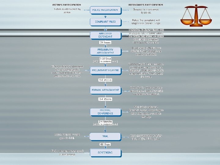 § § § Arraignment Plea is entered (guilty, not guilty, no contest) Plea Bargain, why? Trial- Innocent until proven guilty beyond a reasonable doubt Discovery- Plea bargain Jury selection- Voir Dire Opening statements- both attorneys Testimony (direct and cross examination) Closing Statements- both attorneys Jury deliberation Verdict- Jury ( Guilty, or acquitted, that means not guilty) Sentencing- Judge has mandatory sentencing.