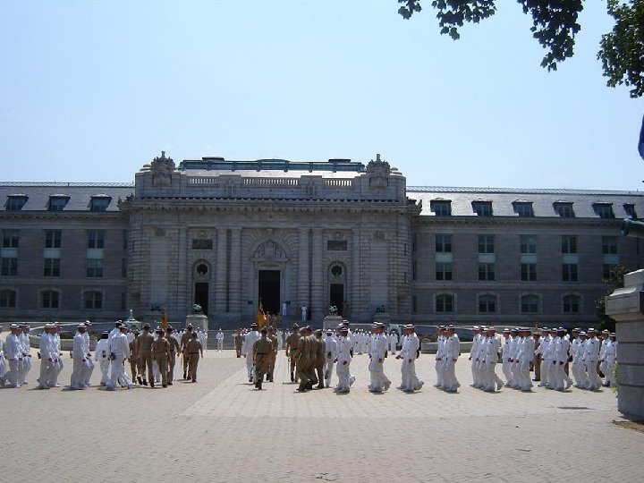 Bancroft Hall and midshipmen at noon meal formations exercises