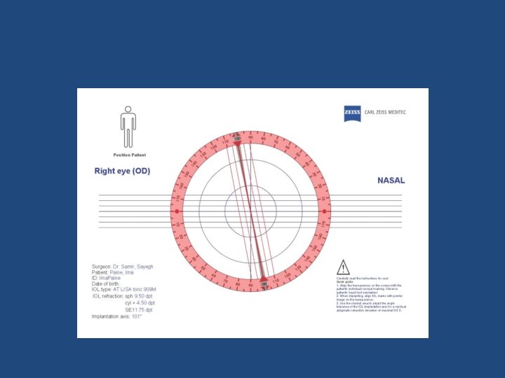 Astigmatism and Cataract Surgery • When natural lens is removed, the only possible source of astigmatism left is the cornea • Cornea directly accessible for measurement – Corneal Topography: measures power and orientation of the principle planes – By Euler's formula, these will always be perpendicular – To correct astigmatism with an IOL, need an aspherical lens with principal plane powers that will cancel astigmatism, and need to know the orientation to implant the lens.
