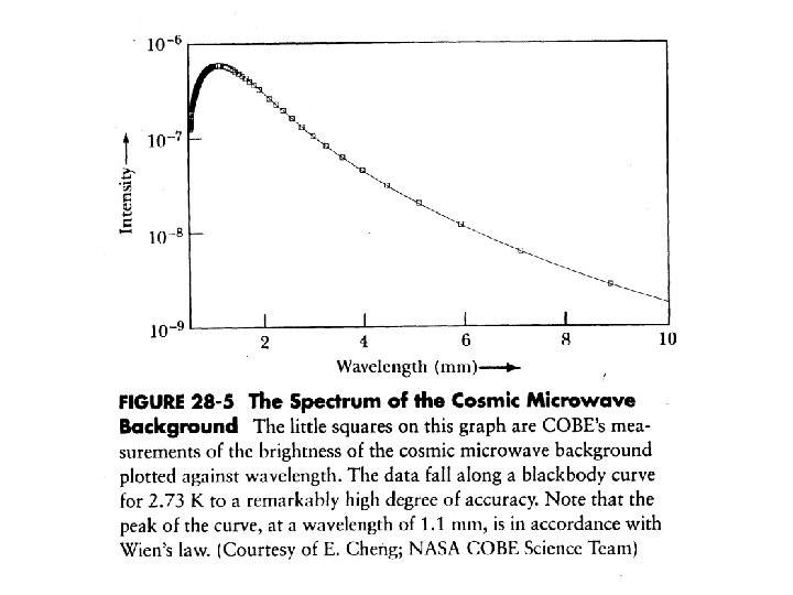 THE UNIVERSE AND COSMOLOGY • The intense radiation field which accompanied the Big Bang is still evident today, as the cosmic background radiation. • This background radiation was first detected in ground-based microwave measurements by A. Penzias and R. Wilson in 1965. • The Cosmic Background Explorer satellite (COBE), launched in 1989, had as a major objective the detailed measurement of this microwave background radiation. • This radiation, initially characteristic of multi-million degree temperatures, has been red-shifted by the expansion of the Universe so that it now corresponds to black-body radiation characteristic of a temperature of 2. 73 K. • Small variations in the intensity of this background radiation over the sky may indicate the initial fragmentation of the material into clumps capable of condensing to form galaxies. • The recently launched Wilkinson Microwave Anisotropy Probe (WMAP) mission is now obtaining much more detailed mapping of the cosmic background radiation over large regions of the sky.