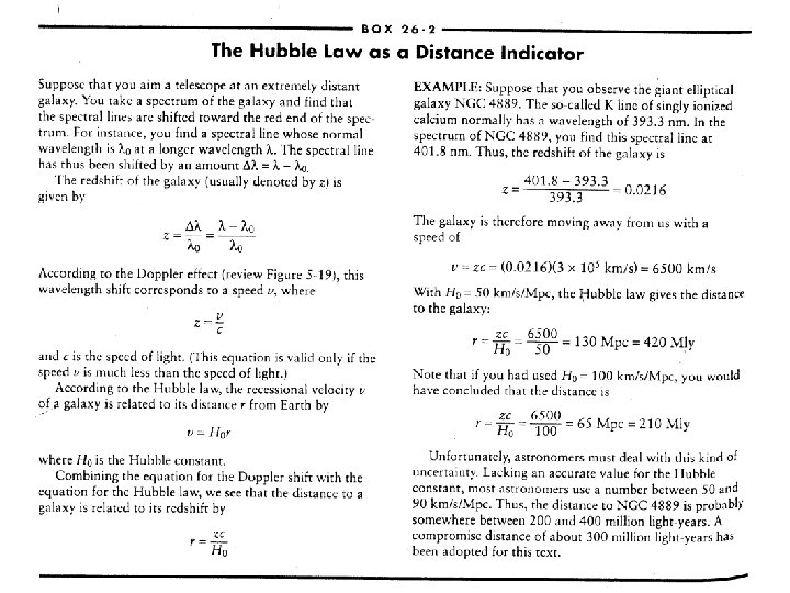THE UNIVERSE AND COSMOLOGY • The age of the Universe, until very recently, was not well established, but is now believed to be about 13. 7 billion years, or about 3 times the age of our Solar System. • The Universe is thought to have originated in a point-like concentration, which began expanding outward in a “big bang” at the speed of light. • Over very large distances, the expansion velocity and other properties of the Universe are such that theory of general relativity must be used for quantitative descriptions. • The Hubble Constant H 0 = v/R, indicated that the apparent recession velocity of an object, v, is proportional to its distance, R, to the distances accessible until recently with ground-based telescopes. • However, with the advent of more powerful space- and groundbased telescopes and instrumentation, there are now indications that H 0 is not constant, but changes with apparent distance (redshift). • Accurate determinations of H 0 are needed in order to determine the age and evolution of the Universe.