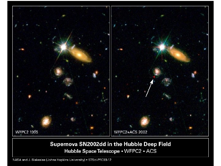THE UNIVERSE AND COSMOLOGY • Establishment of values for H 0 requires measuring the recession velocity of objects for which other means (other than redshift) of determining the distance, R, are available. • One such means is to observe Cepheid variable stars, whose periods of variation are a known function of absolute luminosity. • Another method, applicable to greater distances, is observations of Type I supernovas (exploding white dwarfs) which are much brighter than Cepheid variables (but unpredictable in advance). • The Hubble Space Telescope has provided the capability to observe Cepheid variables and other distance indicators to much greater distances than has been possible previously. • The self-gravitation of the Universe acts to slow down the expansion with time since the Big Bang (characterized by the deceleration parameter q 0); hence it is presumed that the most distant objects would appear to be receding at a faster rate than in direct proportion to apparent distance. • However, recent observations with HST and other instruments has indicated that the expansion of the Universe is increasing with time!