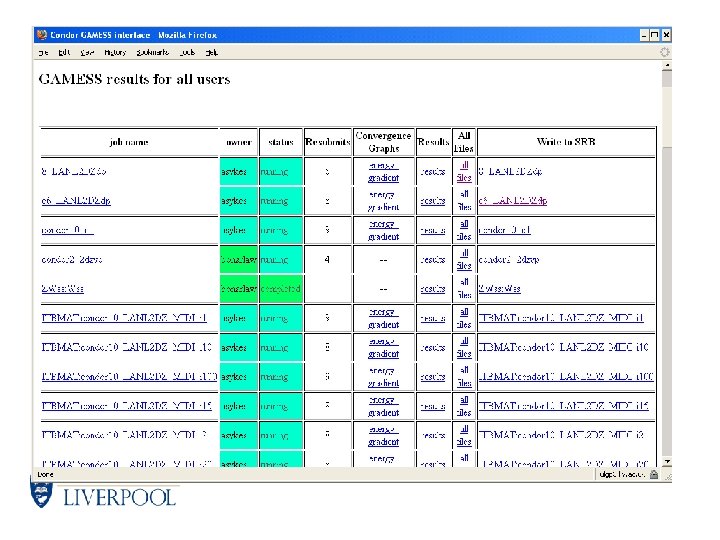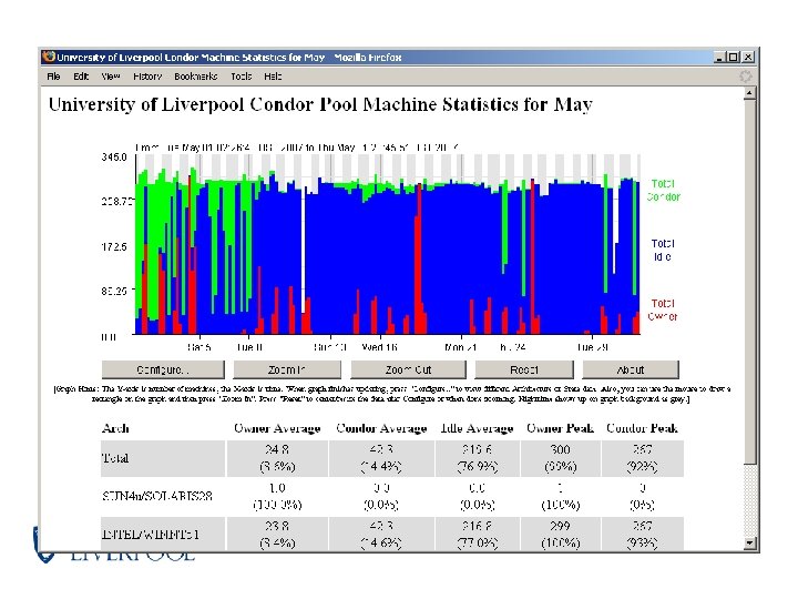 University of Liverpool Condor Pool § contains around 300 machines running the University’s Managed Windows (XP) Service. § most have 2. 33 GHz Intel Core 2 processors with 2 GB RAM, 80 GB disk, configured with two job slots / machine. § software updates via a weekly re-imaging process. § single combined submit host / central manager running on Sun Solaris V 440 SMP server. § restricted access to submit host for registered Condor users. § currently running Condor 7. 0. 2 (moving to 7. 4. 2 soon hopefully). § policy is to run jobs only if a least 5 minutes of inactivity and low load average during office hours and at anytime outside of office hours.