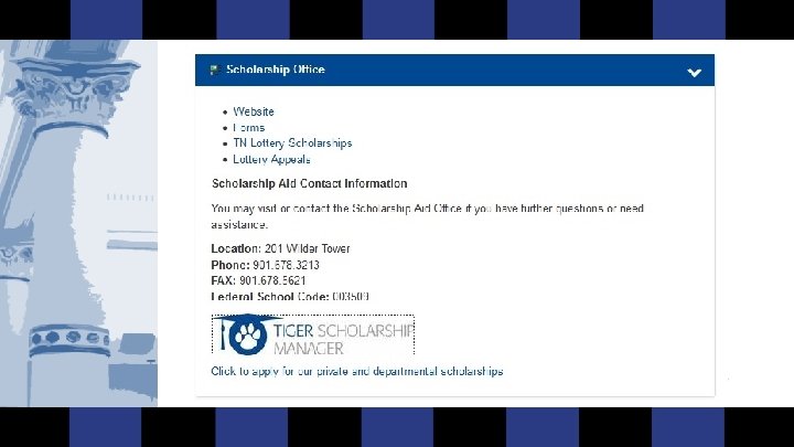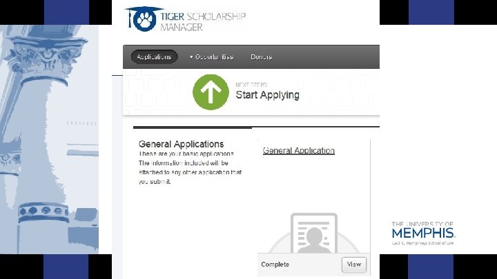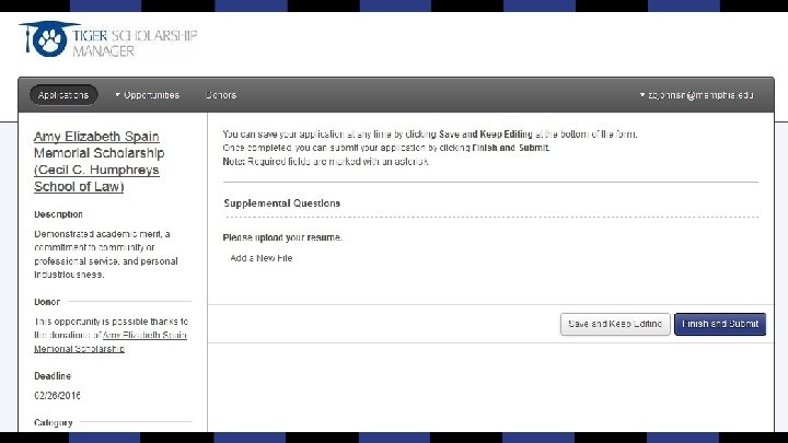 Tiger Scholarship Manager – Access & Diversity and Law School Specific Scholarships, Deadline is March 24, 2017. My. Memphis Click on “Account$” Tab Sign in to your profile using Memphis credentials First page is “Your General Application” When completed click on blue “Finish & Continue” button. Your “Recommended Opportunities” will be available for you based on your answers to the General Application. Detailed information on the scholarship is available by clicking the “apply” button.
