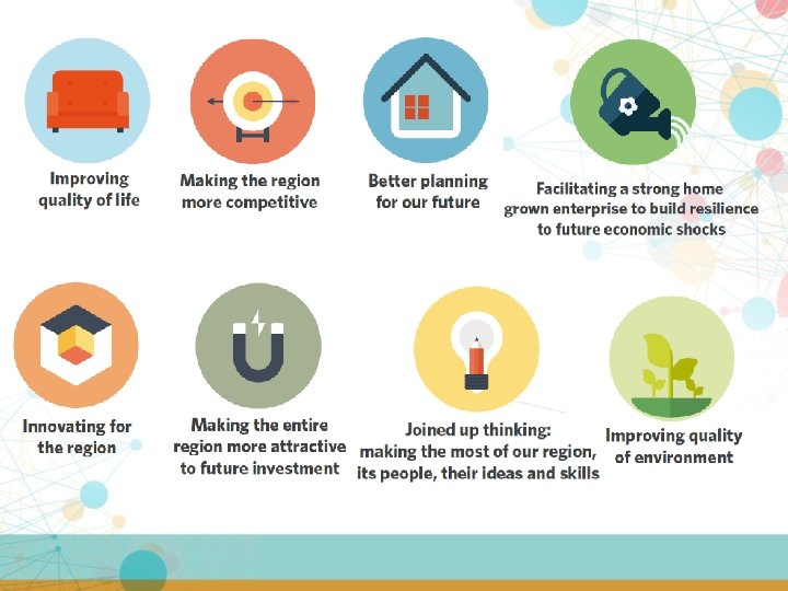 Scope and Content of RSES – Economic Elements The economic elements of the RSES will focus on: ØCreating and sustaining jobs ØIdentifying regional strengths and opportunities ØIdentifying the regional attributes that are essential to enhancing regional economic performance including; • the quality of the environment • the qualities of cities, towns and rural areas • physical infrastructure, and • social, community and cultural facilities ØProposals for augmenting the economic performance of the region